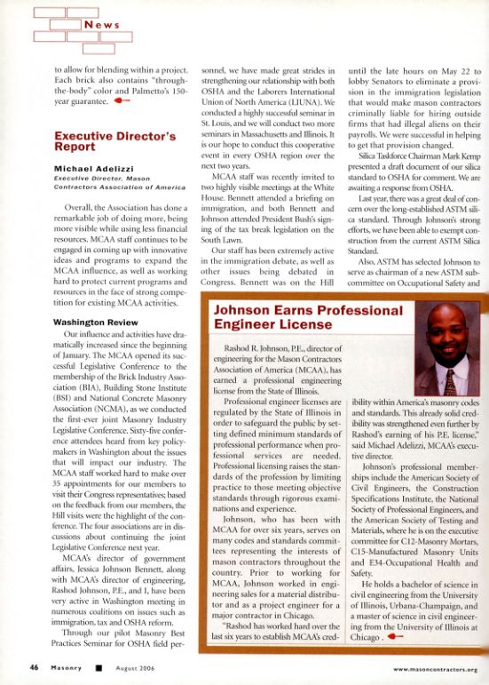 Rashod R. Johnson, P.E., director of engineering for the Mason Contractors Association of America (MCAA), has earned a professional engineering license from the State of Illinois.