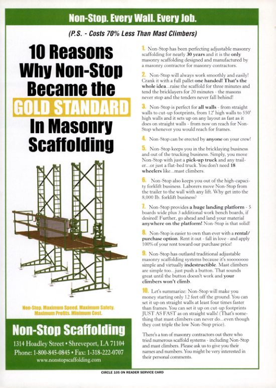 There's a ton of masonry contractors out there who tried numerous scaffold systems - including Non-Stop and mast climbers. Please ask us to give you their names and numbers. You might be very interested in their personal comments.