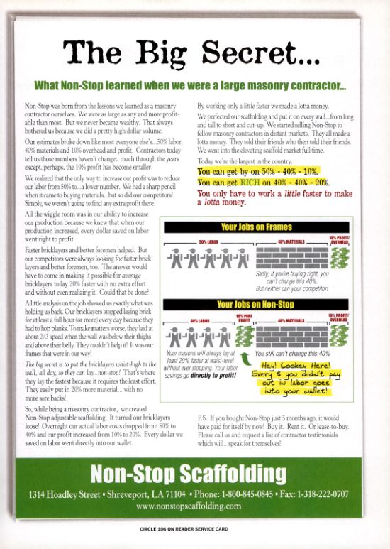 So, while being a masonry contractor, we created Non-Stop adjustable scaffolding. It turned our bricklayers loose! Overnight our actual labor costs dropped from 50% to 40% and our profit increased from 10% to 20%. Every dollar we saved on labor went directly into our wallet.