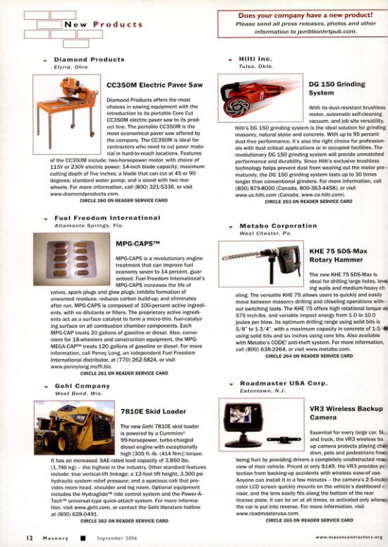 Diamond Products offers the most choices in sawing equipment with the introduction to its portable Core Cut CC350M electric paver saw to its product line. The portable CC350M is the most economical paver saw offered by the company. The CC350M is ideal for contractors who need to cut paver material in hard-to-reach locations. Features of the CC350M include: two-horsepower motor, with choice of 115V or 230V electric power: 14-inch blade capacity; maximum cutting depth of five inches: a blade that can cut at 45 or 90 degrees; standard water pump; and a stand with two rear wheels. For more information, call (800) 321-5336, or visit www.diamondproducts.com.