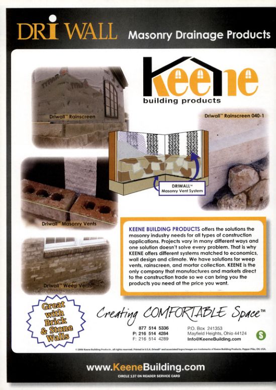 KEENE BUILDING PRODUCTS offers the solutions the masonry industry needs for all types of construction applications. Projects vary in many different ways and one solution doesn't solve every problem. That is why KEENE offers different systems matched to economics, wall design and climate. We have solutions for weep vents, rainscreen, and mortar collection. KEENE is the only company that manufactures and markets direct to the construction trade so we can bring you the products you need at the price you want.