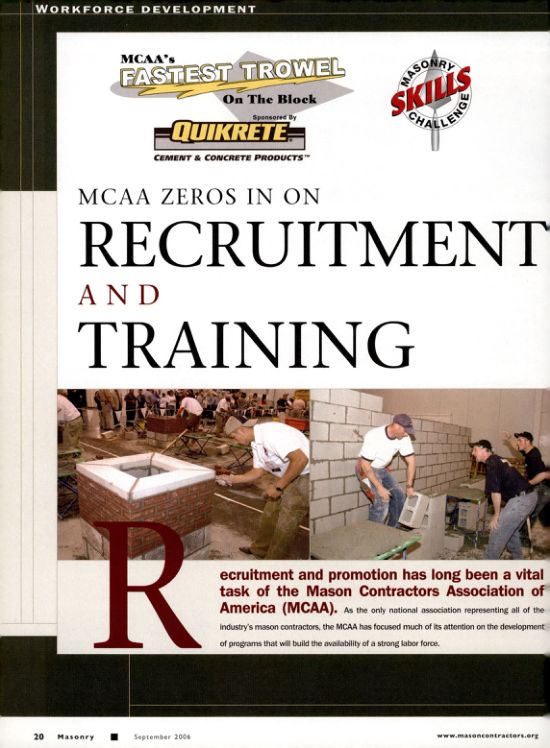 Recruitment and promotion has long been a vital task of the Mason Contractors Association of America (MCAA). As the only national association representing all of the industry's mason contractors, the MCAA has focused much of its attention on the development of programs that will build the availability of a strong labor force.