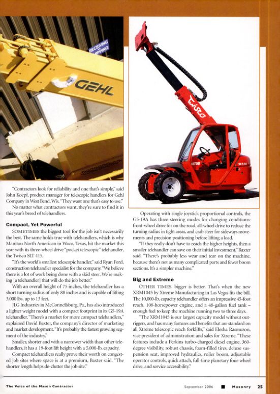 OTHER TIMES, bigger is better. That's when the new XRM1045 by Xtreme Manufacturing in Las Vegas fits the bill. The 10,000-lb. capacity telehandler offers an impressive 45-foot reach, 108-horsepower engine, and a 48-gallon fuel tank enough fuel to keep the machine running two to three days.