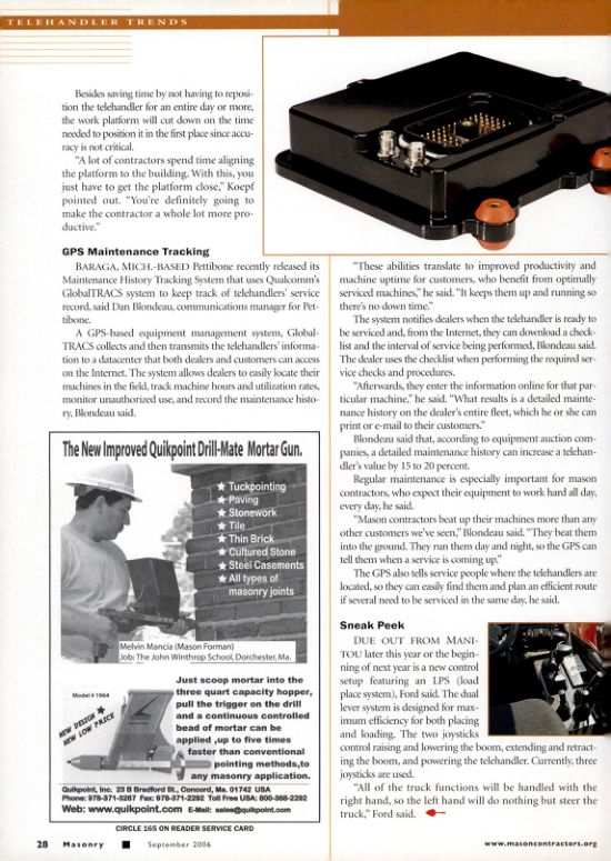 BARAGA, MICH.-BASED Pettibone recently released its Maintenance History Tracking System that uses Qualcomm's GlobalTRACS system to keep track of telehandlers' service record, said Dan Blondeau, communications manager for Pettibone. A GPS-based equipment management system, GlobalTRACS collects and then transmits the telehandlers' information to a datacenter that both dealers and customers can access on the Internet. The system allows dealers to easily locate their machines in the field, track machine hours and utilization rates, monitor unauthorized use, and record the maintenance history, Blondeau said.