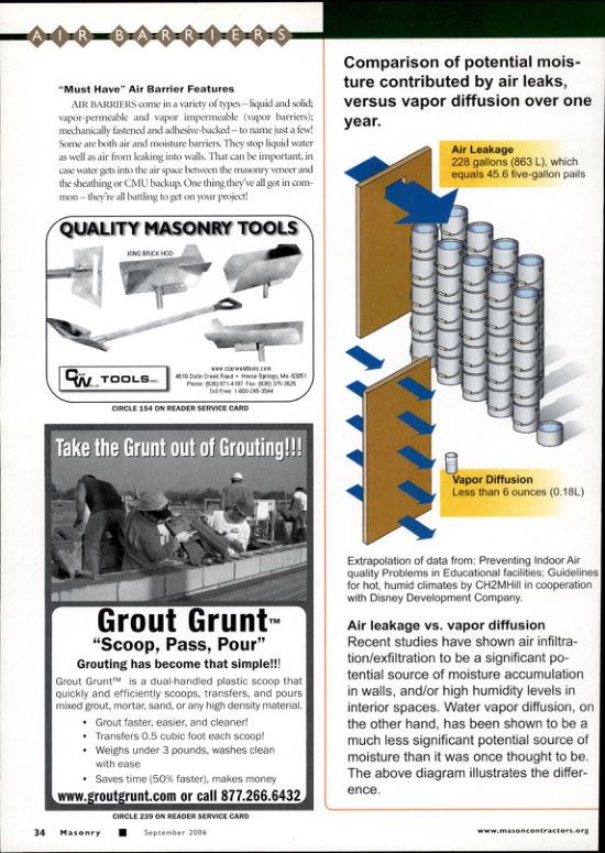 AIR BARRIERS come in a variety of types - liquid and solid; vapor-permeable and vapor impermeable (vapor barriers); mechanically fastened and adhesive-backed - to name just a few! Some are both air and moisture barriers. They stop liquid water as well as air from leaking into walls. That can be important, in case water gets into the air space between the masonry veneer and the sheathing or CMU backup. One thing they've all got in common-they're all battling to get on your project!