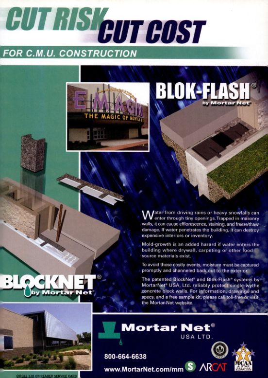 The patented BlockNet" and Blok-Flash" systems by MortarNet USA, Ltd. reliably protect single-wythe concrete block walls. For information, drawings and specs, and a free sample kit, please call toll-free or visit the Mortar Net website.