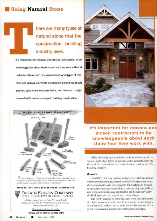 It's important for masons and mason contractors to be knowledgeable about each stone that they work with and understand how each type was formed, what types of minerals and natural elements are present behind the rough exterior, each one's characteristics, and how each might be used to its best advantage in building construction.
