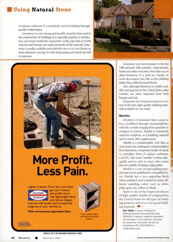 Ron Willis is owner of Masonry Estimating and Consulting Services (MEACS). A veteran masonry estimator, he has been in the masonry business for more than 40 years. He can be reached at (817) 822-8595 or ron@meacs.com.