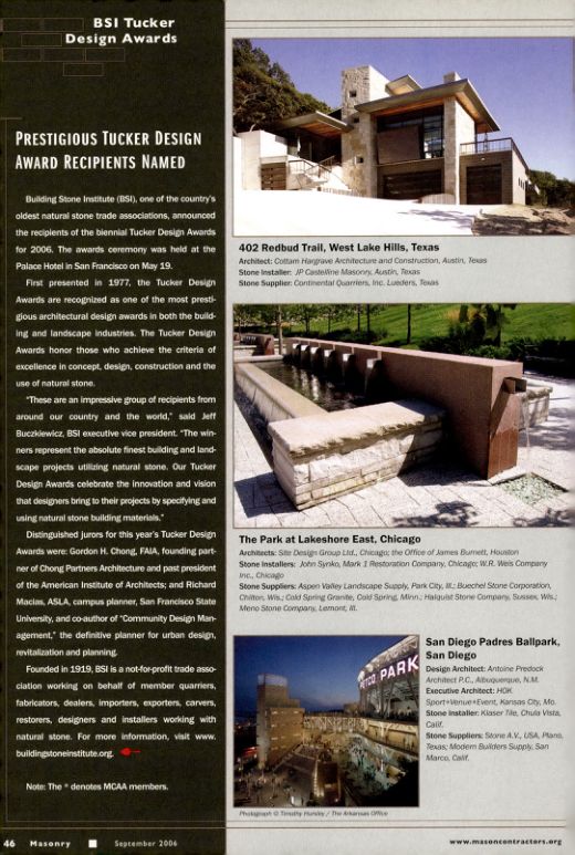 Building Stone Institute (BSI), one of the country's oldest natural stone trade associations, announced the recipients of the biennial Tucker Design Awards for 2006. The awards ceremony was held at the Palace Hotel in San Francisco on May 19.