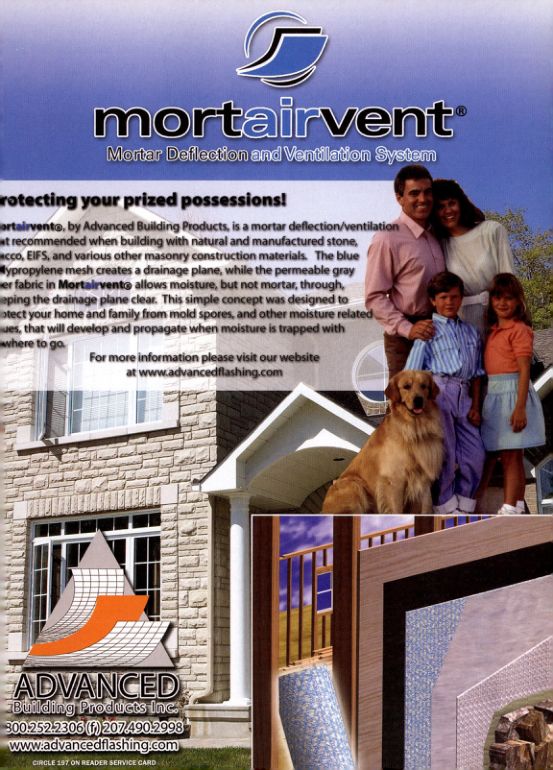 Mortairvento, by Advanced Building Products, is a mortar deflection/ventilation mat recommended when building with natural and manufactured stone, stucco, EIFS, and various other masonry construction materials. The blue polypropylene mesh creates a drainage plane, while the permeable gray filter fabric in Mortairvento allows moisture, but not mortar, through, keeping the drainage plane clear. This simple concept was designed to protect your home and family from mold spores, and other moisture related issues, that will develop and propagate when moisture is trapped with nowhere to go.
