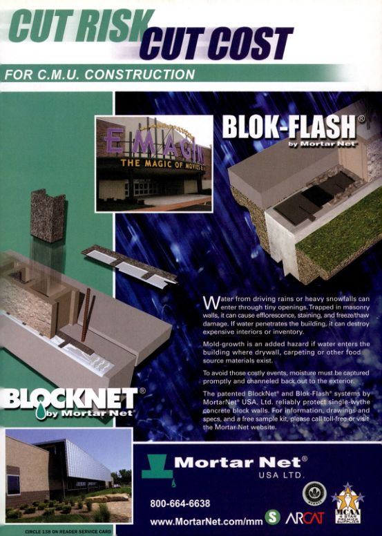 The patented BlockNet and Blok-Flash" systems by MortarNet USA, Ltd. reliably protect single-wythe concrete block walls. For information, drawings and specs, and a free sample kit, please call toll-free or visit the Mortar Net website.