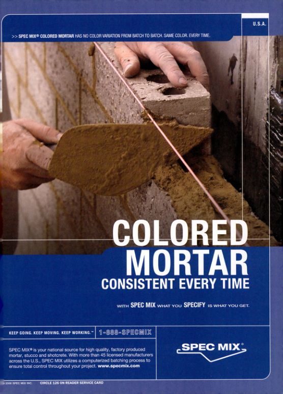 SPEC MIX® is your national source for high quality, factory produced mortar, stucco and shotcrete. With more than 45 licensed manufacturers across the U.S., SPEC MIX utilizes a computerized batching process to ensure total control throughout your project. www.specmix.com 2006 SPEC MIX INC. CIRCLE 126 ON READER SERVICE CARD