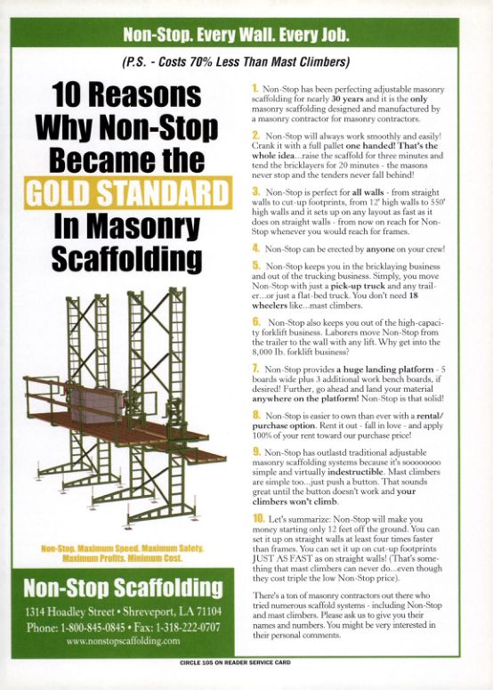 1. Non-Stop has been perfecting adjustable masonry scaffolding for nearly 30 years and it is the only masonry scaffolding designed and manufactured by a masonry contractor for masonry contractors.