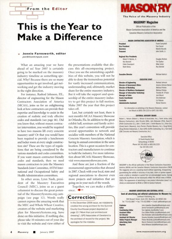 In other areas, Lynn Nash, president of the Masonry Executives Council (MEC), joins us as a guest columnist to discuss the great potential of the MasonrySystems.org campaign (see page 12). Words really cannot express the amazing work that the MEC and Whole Wheat Creative, creators of the website and marketing plan for MasonrySystems.org, have done on this initiative. If nothing else, please take 10 minutes out of your day to visit the website and view either of the presentations available that discuss this all-encompassing project. Once you see the astonishing capabilities of this website, you will not be able to deny the tremendous potential for vastly increased communication, understanding and, ultimately, market share for the entire masonry industry. But it will take the support and sponsorship of the entire masonry industry to get this project in full motion. Make 2007 the year that this project takes off.