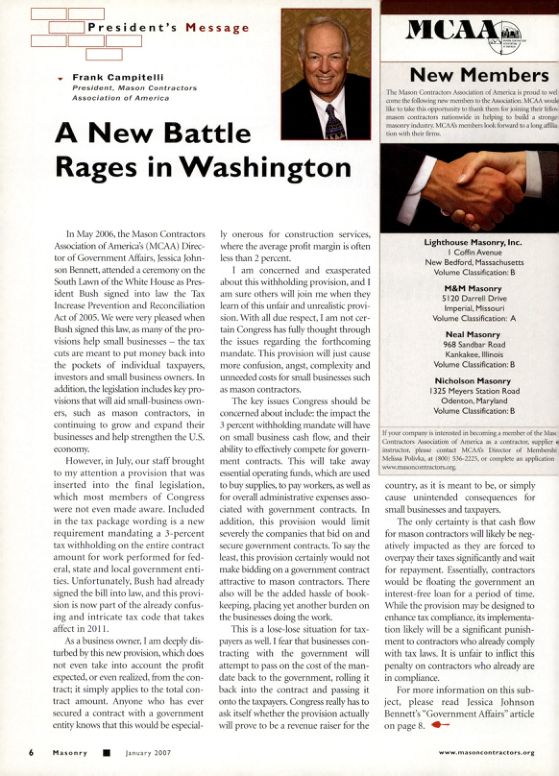 In May 2006, the Mason Contractors Association of America's (MCAA) Director of Government Affairs, Jessica Johnson Bennett, attended a ceremony on the South Lawn of the White House as President Bush signed into law the Tax Increase Prevention and Reconciliation Act of 2005. We were very pleased when Bush signed this law, as many of the provisions help small businesses; the tax cuts are meant to put money back into the pockets of individual taxpayers, investors and small business owners. In addition, the legislation includes key provisions that will aid small-business owners, such as mason contractors, in continuing to grow and expand their businesses and help strengthen the U.S. economy.
