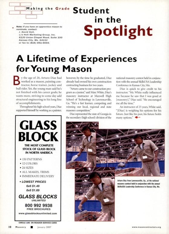 "Arturo came to our construction program as a junior," said Marc White, Diaz's masonry instructor at Maxwell High School of Technology in Lawrenceville, Ga. "He's a fast learner, competing and winning our local, regional and state masonry competition."