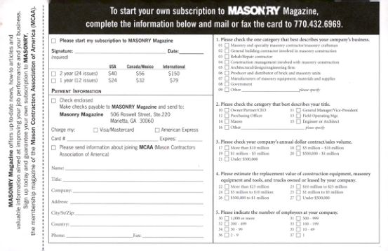 To start your own subscription to MASONRY Magazine, complete the information below and mail or fax the card to 770.432.6969.