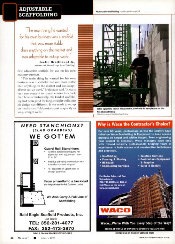 "The main thing he wanted for his own business was a scaffold that was more stable than anything on the market and was adaptable to cut-up work." Justin Breithaupt Jr., owner of Non-Stop Scaffolding. first adjustable scaffold for use on his own masonry projects.