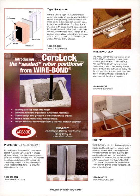 Installing rebar has never been easier! Eliminates movement of positioner during rebar installation. Diagonal design locks positioner 1-1/4" deep into core of CMU. Rebar is always automatically centered in core. Visit our website at www.wirebond.com to see other photos of Corelock!