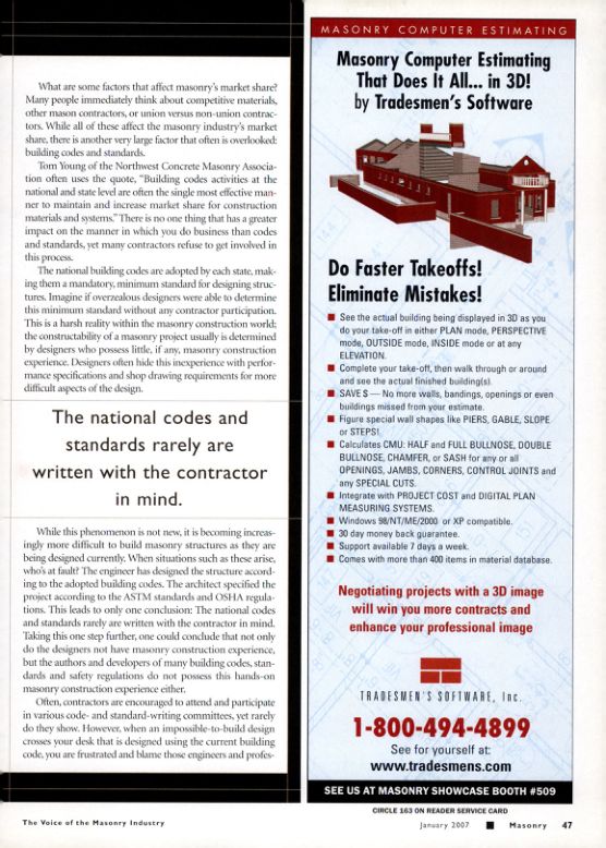 Negotiating projects with a 3D image will win you more contracts and enhance your professional image. TRADESMEN'S SOFTWARE, Inc. 1-800-494-4899 See for yourself at: www.tradesmens.com SEE US AT MASONRY SHOWCASE BOOTH #509