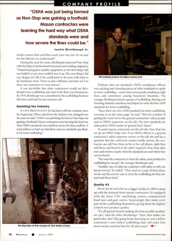 "OSHA was just being formed as Non-Stop was gaining a foothold. Mason contractors were learning the hard way what OSHA standards were and how severe the fines could be."