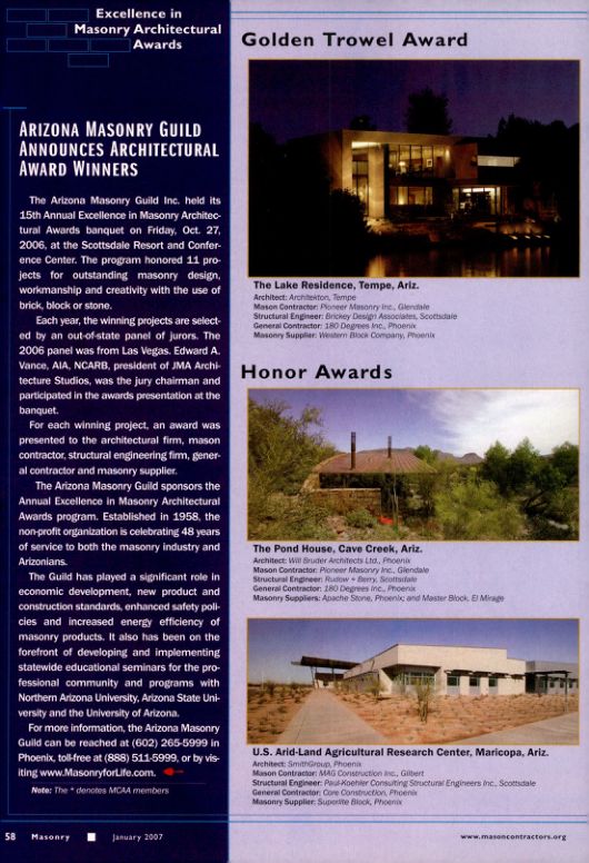 The Arizona Masonry Guild sponsors the Annual Excellence in Masonry Architectural Awards program. Established in 1958, the non-profit organization is celebrating 48 years of service to both the masonry industry and Arizonians.
