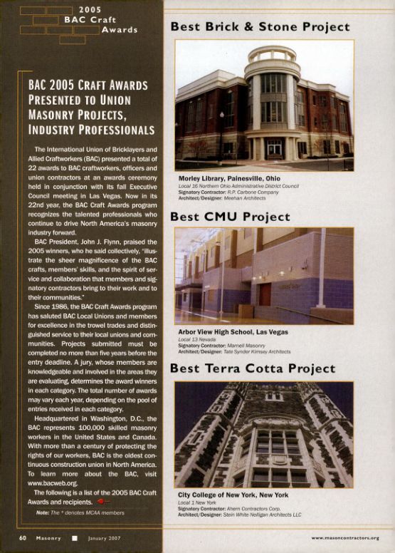 BAC President, John J. Flynn, praised the 2005 winners, who he said collectively, "illustrate the sheer magnificence of the BAC crafts, members' skills, and the spirit of service and collaboration that members and signatory contractors bring to their work and to their communities."