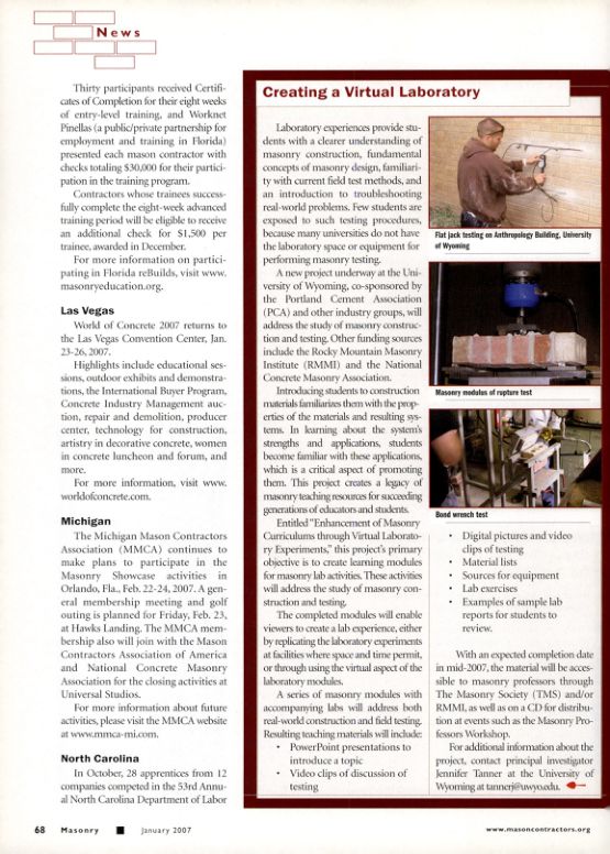 With an expected completion date in mid-2007, the material will be accessible to masonry professors through The Masonry Society (TMS) and/or RMMI, as well as on a CD for distribution at events such as the Masonry Professors Workshop.