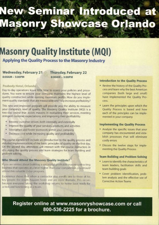 This new-and-improved program will provide you the ability to measure your company's level of quality. The Masonry Quality Institute (MQI) is a two-day course that assists masons in evaluating their services, meeting stringent customer expectations, and improving their profitability.