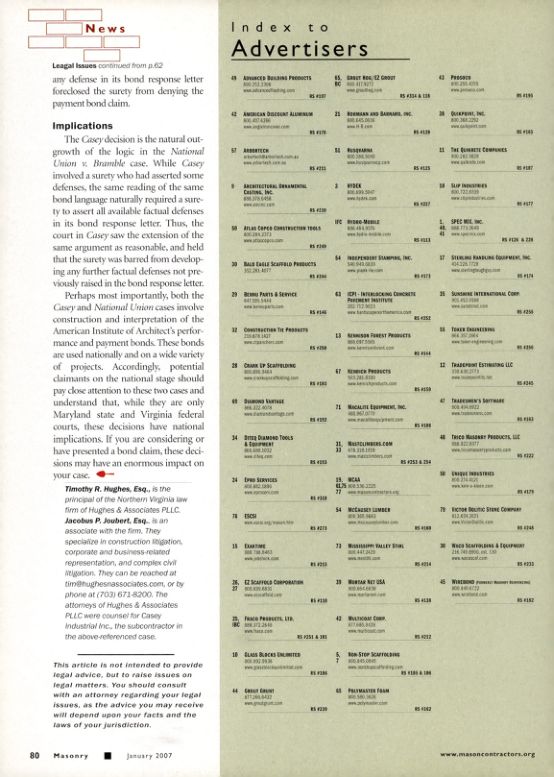Timothy R. Hughes, Esq., is the principal of the Northern Virginia law firm of Hughes & Associates PLLC. Jacobus P. Joubert, Esq., is an associate with the firm. They specialize in construction litigation, corporate and business-related representation, and complex civil Ntigation. They can be reached at tim@hughesnassociates.com, or by phone at (703) 671-8200. The attomeys of Hughes & Associates PLLC were counsel for Casey Industrial Inc., the subcontractor in the above-referenced case.