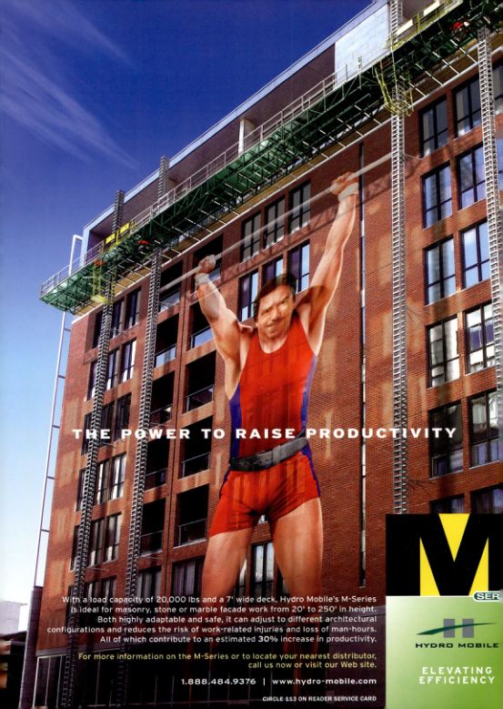 With a load capacity of 20,000 lbs and a 7' wide deck, Hydro Mobile's M-Series is ideal for masonry, stone or marble facade work from 20 to 250' in height.