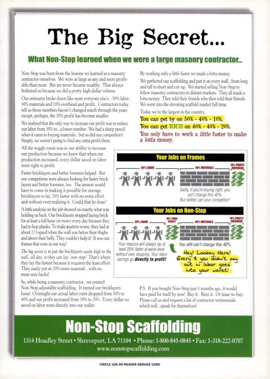 By working only a little faster we made a lotta money. We perfected our scaffolding and put it on every wall...from long and tall to short and cut-up. We started selling Non-Stop to fellow masonry contractors in distant markets. They all made a lotta money. They told their friends who then told their friends. We went into the elevating scaffold market full time.