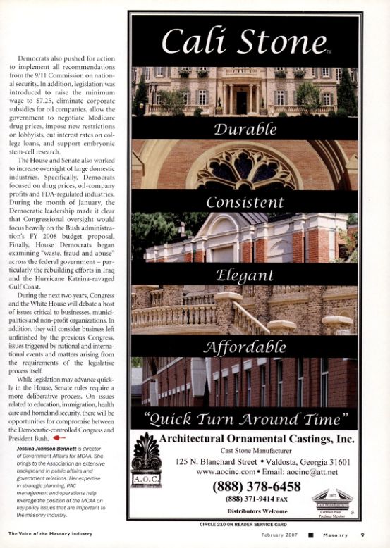Jessica Johnson Bennett is director of Government Affairs for MCAA. She brings to the Association an extensive background in public affairs and government relations. Her expertise in strategic planning, PAC management and operations help leverage the position of the MCAA on key policy issues that are important to the masonry industry.