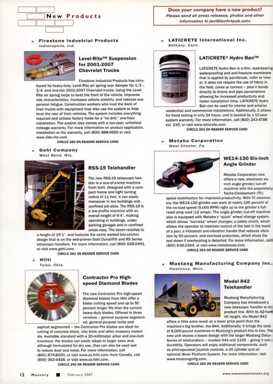 The new Contractor Pro high-speed diamond blades from Hilti offer a faster cutting speed and up to 50 percent longer life than the current heavy-duty blades. Offered in three versions-general purpose segmented, general purpose turbo and asphalt segmented - the Contractor Pro blades are ideal for cutting of concrete block, clay brick and other masonry materials. Available standard with a 20-millimeter arbor and one-inch knockout, the blades can easily adapt to larger saws and, although formulated for dry use, they can also be used wet to reduce dust and noise. For more information, call (800) 879-8000, or visit www.us.hilti.com; from Canada, call (800) 363-4458, or visit www.ca.hilti.com.