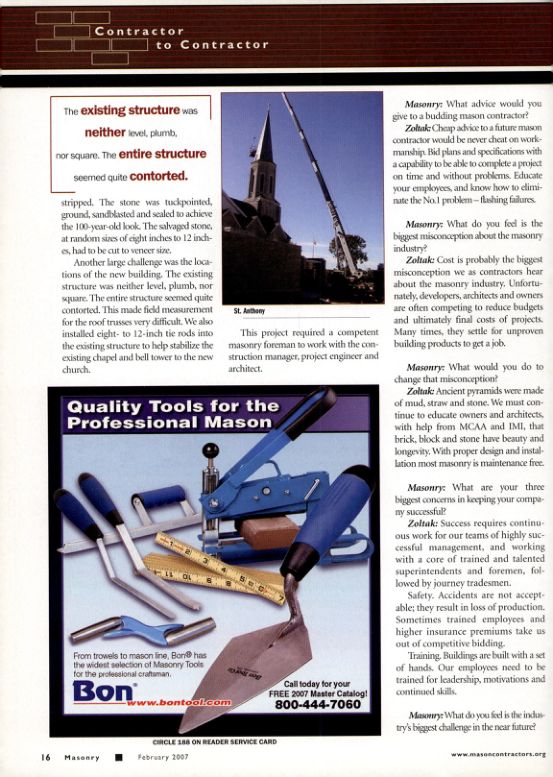 Zoltak: Cheap advice to a future mason contractor would be never cheat on workmanship. Bid plans and specifications with a capability to be able to complete a project on time and without problems. Educate your employees, and know how to eliminate the No.1 problem-flashing failures.