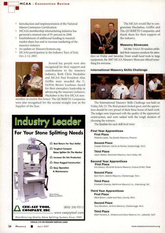 Several key people were also recognized for their support and contributions to the masonry industry. Both Chris Huckabee and MCAA Past President Alan Griffin were awarded the C. DeWitt Brown Leadman Award for their exemplary leadership in advancing the masonry industry; Huckabee is the first MCAA non-member to receive this honor. The QUIKRETE Companies were also recognized for the second straight year as the Supplier of the Year.