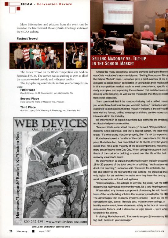 Among the many educational sessions provided during the three was Chris Huckabee's much-anticipated "Selling Masonry vs. Tilt-up in the School Market" class. Huckabee gave a brief overview of the tools available to assist mason contractors in taking back their market share in this competitive market, such as cost comparisons, specific case study examples, and explaining the confusion that architects are experiencing with masonry, as well as the messages that they're receiving from other industries.