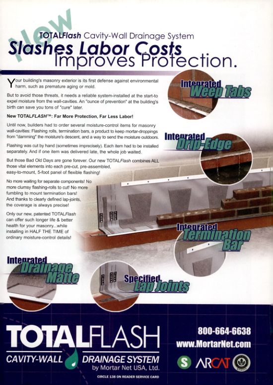 Until now, builders had to order several moisture-control items for masonry wall-cavities: Flashing rolls, termination bars, a product to keep mortar-droppings from "damming" the moisture's descent, and a way to send the moisture outdoors.
