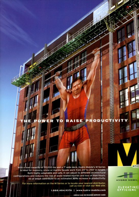 With a load capacity of 20,000 lbs and a 7' wide deck, Hydro Mobile's M-Series is ideal for masonry, stone or marble facade work from 20 to 250' in height.