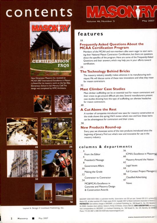 MASONRY (ISSN 0025-4681) is published monthly. Subscription rate $24 per year: Canada $30 (U.S. currency). Mexico $32, all other countries $79. Single copies $5.50. Copyright 2007 by Mason Contractors Association of America. POSTMASTER: Send address changes to MASONRY, c/o Lionheart Publishing, Inc., 506 Roswell St., Ste. 220, Marietta, GA 30060. Canadian return address: Station A, PO Box 54 Windsor, Ontario N9A 6J5. SEND SUBSCRIPTIONS and business correspondence to: MASONRY, c/o Lionheart Publishing, Inc., 506 Roswell St., Ste. 220, Marietta, GA 30060. Phone: 770-431-0867 or 888-303-5639. www.masonrymagazine.com.