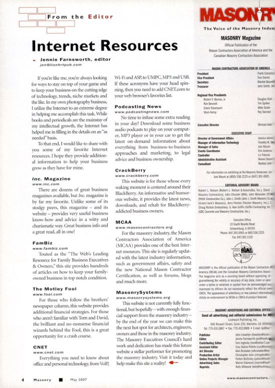 For the masonry industry, the Mason Contractors Association of America (MCAA) provides one of the best Internet resources. This site is regularly updated with the latest industry information, such as government affairs, safety and the new National Mason Contractor Certification, as well as forums, blogs and much more.