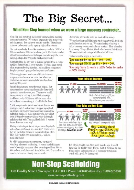 So, while being a masonry contractor, we created Non-Stop adjustable scaffolding. It turned our bricklayers loose! Overnight our actual labor costs dropped from 50% to 40% and our profit increased from 10% to 20%. Every dollar we saved on labor went directly into our wallet.