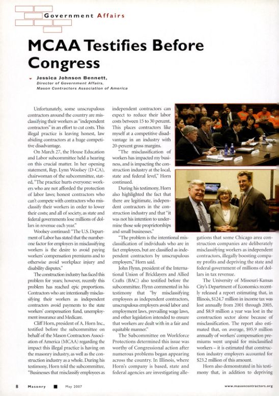 Cliff Horn, president of A. Horn Inc., testified before the subcommittee on behalf of the Mason Contractors Association of America (MCAA) regarding the impact this illegal practice is having on the masonry industry, as well as the construction industry as a whole. During his testimony, Horn told the subcommittee, "Businesses that misclassify employees as independent contractors can expect to reduce their labor costs between 15 to 30 percent. This places contractors like myself at a competitive disadvantage in an industry with 20-percent gross margins.