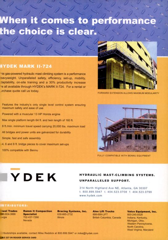 This gas-powered hydraulic mast climbing system is a performance heavyweight. Unparalleled safety, efficiency, set-up, mobility, adaptability, on-site training and a 30% productivity increase are all available through HYDEK's MARK II-724. For a rental or purchase quote call us today.