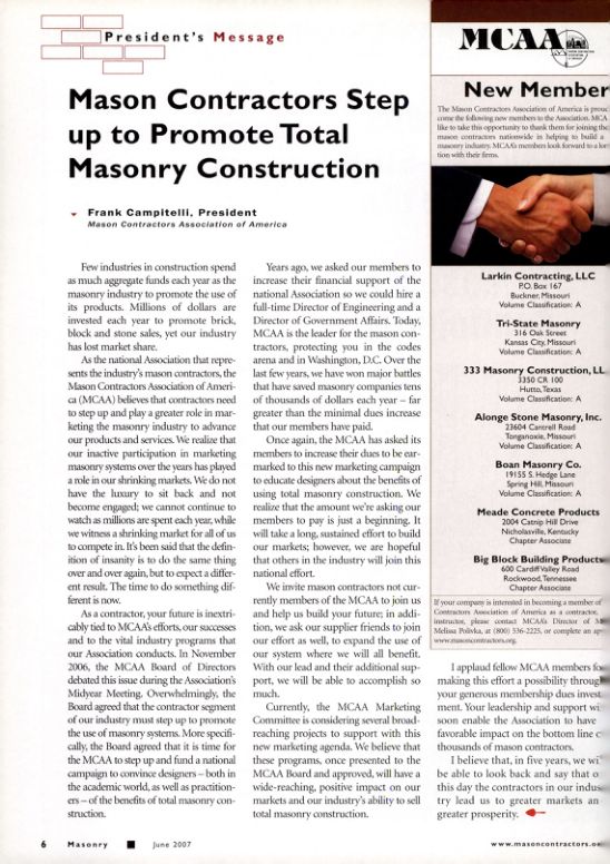 As a contractor, your future is inextricably tied to MCAA's efforts, our successes and to the vital industry programs that our Association conducts. In November 2006, the MCAA Board of Directors debated this issue during the Association's Midyear Meeting. Overwhelmingly, the Board agreed that the contractor segment of our industry must step up to promote the use of masonry systems. More specifically, the Board agreed that it is time for the MCAA to step up and fund a national campaign to convince designers-both in the academic world, as well as practitioners-of the benefits of total masonry construction.