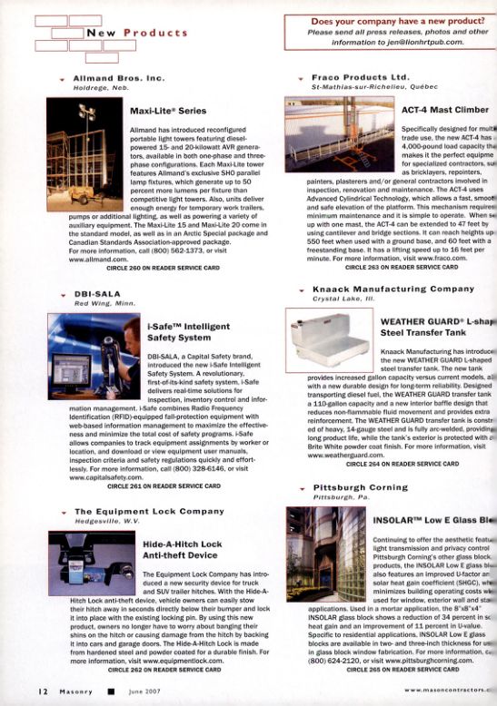 Specifically designed for multi trade use, the new ACT-4 has 4,000-pound load capacity the makes it the perfect equipme for specialized contractors, su as bricklayers, repointers, painters, plasterers and/or general contractors involved in inspection, renovation and maintenance. The ACT-4 uses Advanced Cylindrical Technology, which allows a fast, smoot and safe elevation of the platform. This mechanism requires minimum maintenance and it is simple to operate. When se up with one mast, the ACT-4 can be extended to 47 feet by using cantilever and bridge sections. It can reach heights up 550 feet when used with a ground base, and 60 feet with a freestanding base. It has a lifting speed up to 16 feet per minute. For more information, visit www.fraco.com.