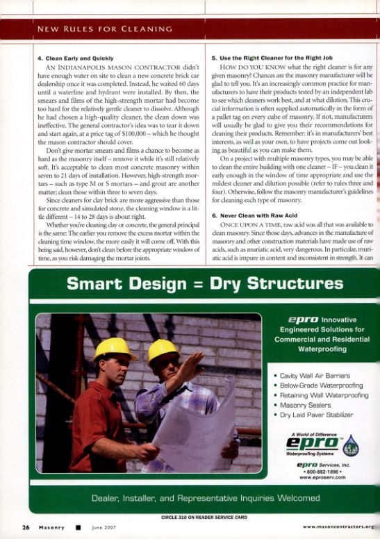 How do you know what the right cleaner is for any given masonry? Chances are the masonry manufacturer will be glad to tell you. It's an increasingly common practice for manufacturers to have their products tested by an independent lab to see which cleaners work best, and at what dilution. This crucial information is often supplied automatically in the form of a pallet tag on every cube of masonry. If not, manufacturers will usually be glad to give you their recommendations for cleaning their products. Remember: it's in manufacturers' best interests, as well as your own, to have projects come out looking as beautiful as you can make them.