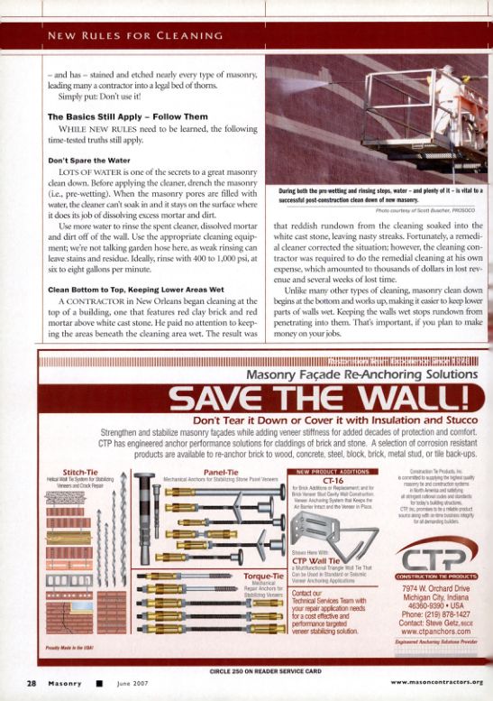 A CONTRACTOR in New Orleans began cleaning at the top of a building, one that features red clay brick and red mortar above white cast stone. He paid no attention to keeping the areas beneath the cleaning area wet. The result was