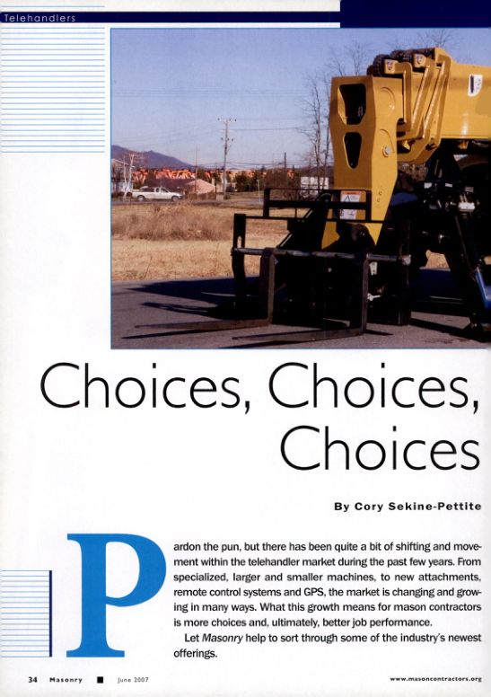 Pardon the pun, but there has been quite a bit of shifting and movement within the telehandler market during the past few years. From specialized, larger and smaller machines, to new attachments, remote control systems and GPS, the market is changing and growing in many ways. What this growth means for mason contractors is more choices and, ultimately, better job performance.
