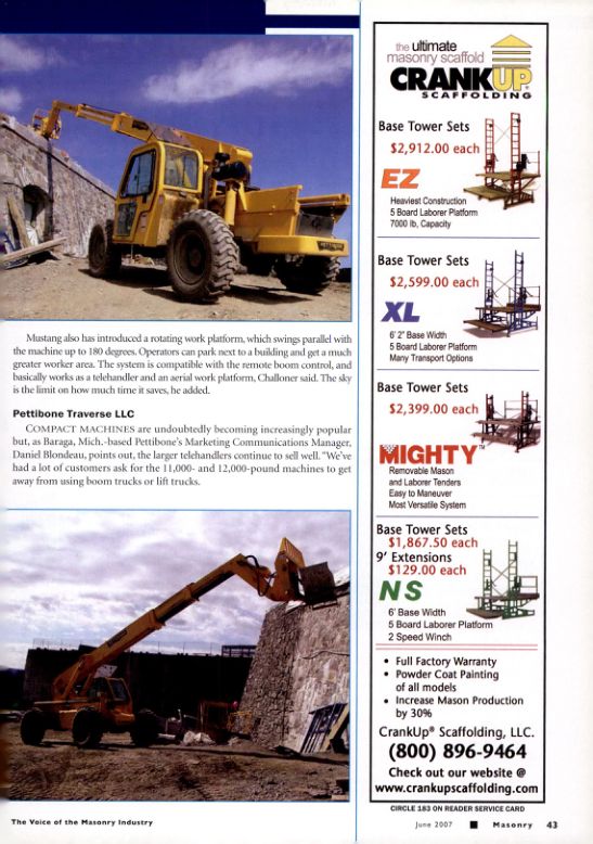 COMPACT MACHINES are undoubtedly becoming increasingly popular but, as Baraga, Mich.-based Pettibone's Marketing Communications Manager, Daniel Blondeau, points out, the larger telehandlers continue to sell well. "We've had a lot of customers ask for the 11,000- and 12,000-pound machines to get away from using boom trucks or lift trucks.